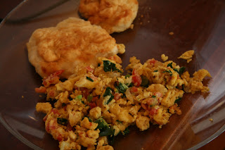 Eggs, chopped kale, diced onion, kelp & salt mixture, pepper, diced tomatoes, & diced bacon or diced Italian sausage.
